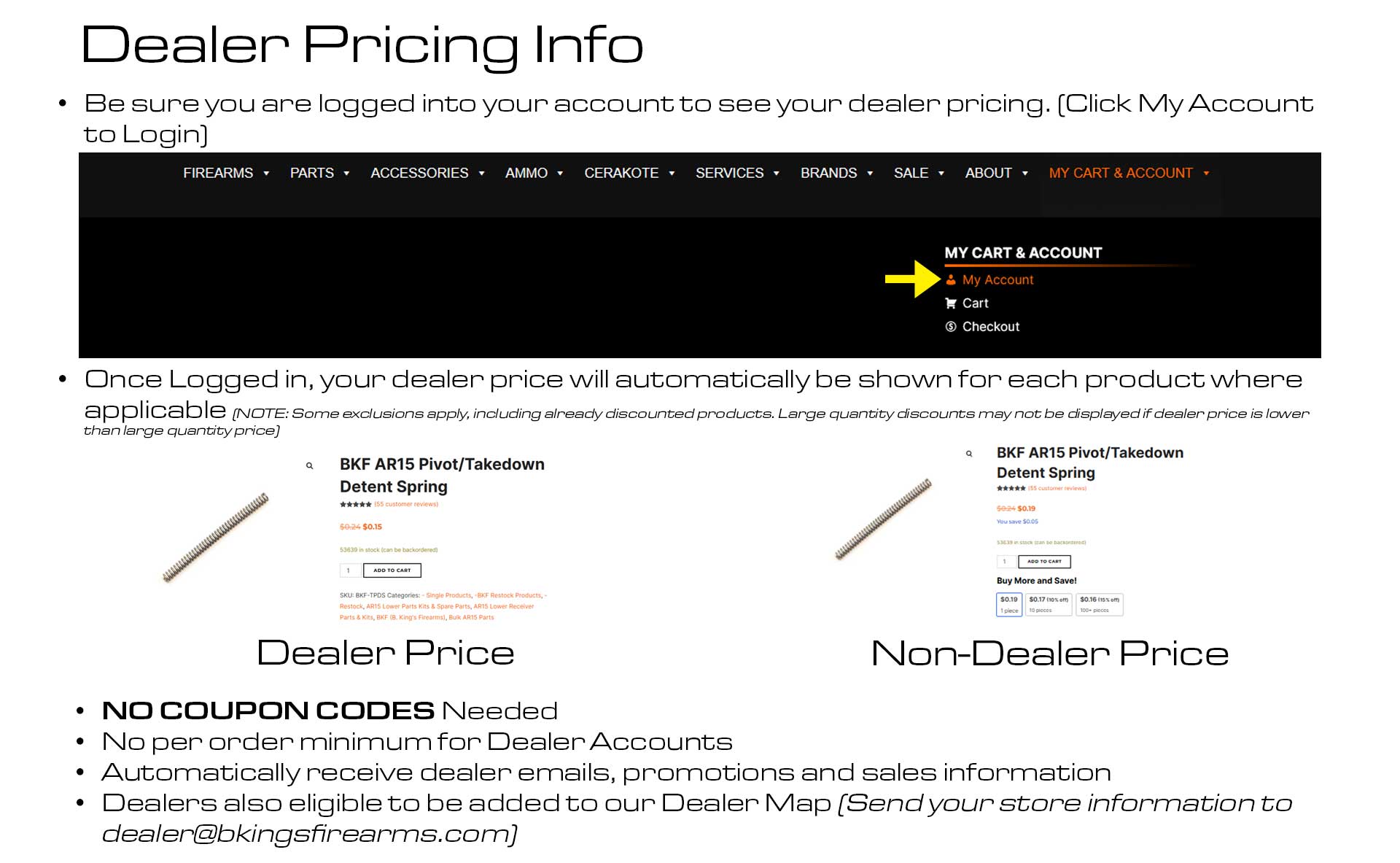 Please email dealer@bkingsfirearms.com with a copy of your FFL and resellers permit. Please use DEALER ACCOUNT as the subject line with your business name. If you haven’t already please create an account.